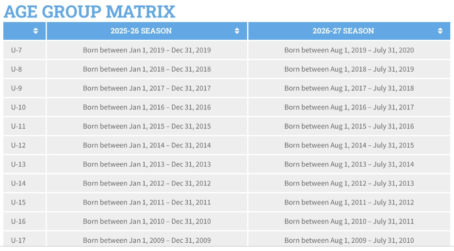 Below, you will find a table outlining the age cut-offs for the 2026/27 season, along with additional information from US Club Soccer explaining the reasoning behind this change.